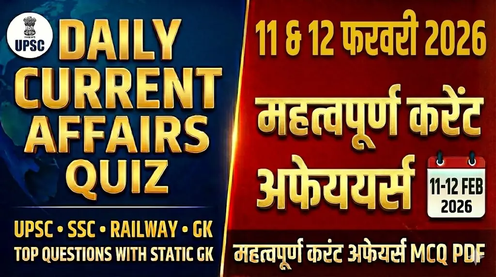 अगर आप competitive exams की तैयारी कर रहे हैं तो 11 & 12 2026 Current Affairs आपके लिए बेहद महत्वपूर्ण है। Daily current affairs हर exam जैसे SSC, UPSC, Banking, Railway, State PCS और Defence exams में पूछे जाते हैं। इसलिए हम आपके लिए लेकर आए हैं complete 11 & 12 2026 Current Affairs MCQ, Quiz & PDF एक ही जगह पर।